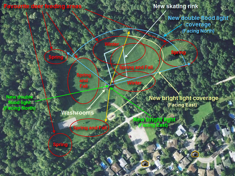 This year, for the first time, there is an Outdoor Skating Rink created and maintained in the park’s eastern soccer field. Also, a very strong light has been fixed on the eastern wall of the washroom/maintenance facility located in the middle of the park. This light stays on all night, even though the park officially closes at 11 p.m. It covers most of the eastern soccer field and the open areas east and south of it. Just recently, two strong area lights have been added above the NE corner of the facility. These lights face north and cover the main part of the ice rink which overlaps the central and north part of the lower (eastern) soccer field. They are on a timer and are being turned off at 11:00 p.m.