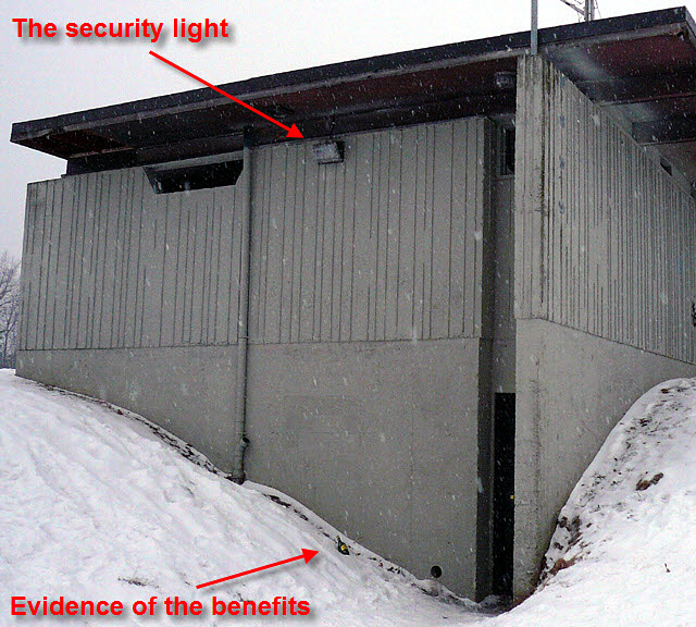 After the seriousness of last week’s reporting, we finally had a good laugh this morning. Twenty two hours after the meeting with Mr. Propedo had ended, the sharp eye of the Dundas Valley Deer Association (DVDA) spotted what can only be seen as an evidence that the “security light” is doing its job. We did not have this often in the past, when the light was not installed yet. Maybe the darkness was effectively deterring the trouble makers. This is what they call a “catch 22”.