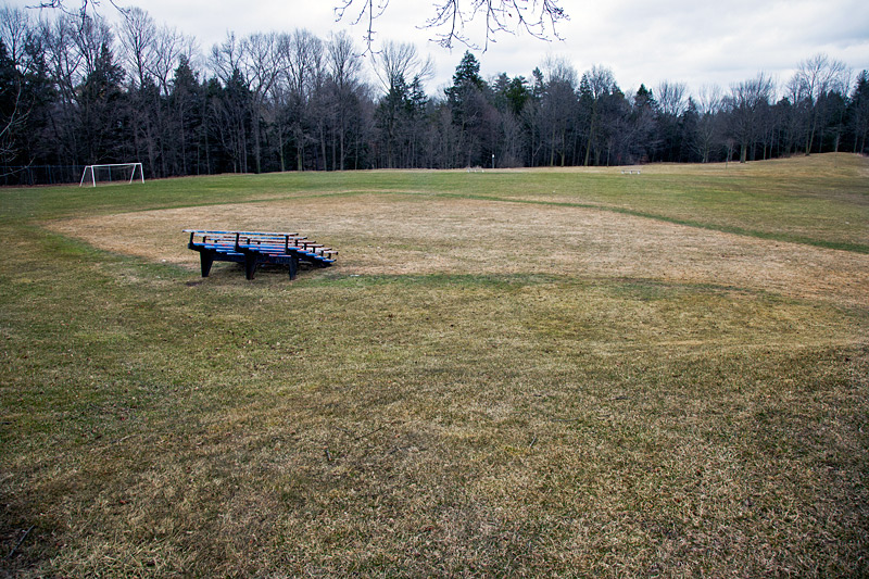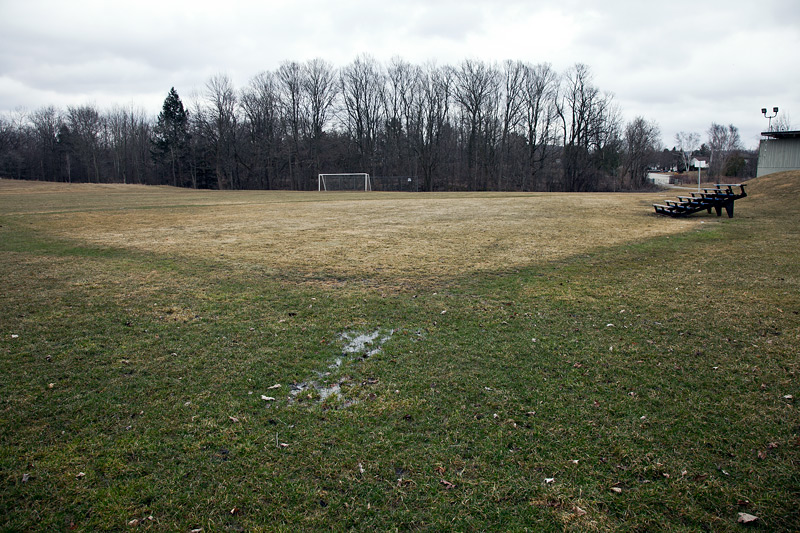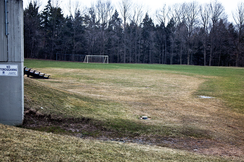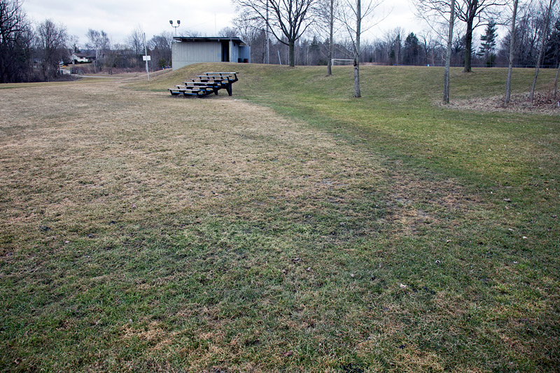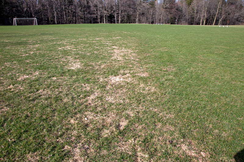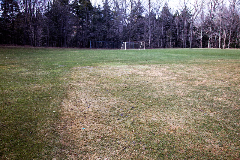 After the ice first melted down at the end of February, it appeared that there was no damage to the grass. The grass under the ice was well-preserved and even greener than the grass around the ice surface. However, as the time passed by, it became apparent that the ice cover had damaged the turf and had negatively affected the ability of grass to regenerate. Much of the grass that was under the ice surface has died off and patches of sand are visible throughout this part of the lower soccer field. The grass outside of the ice rink is healthy, thick and green.