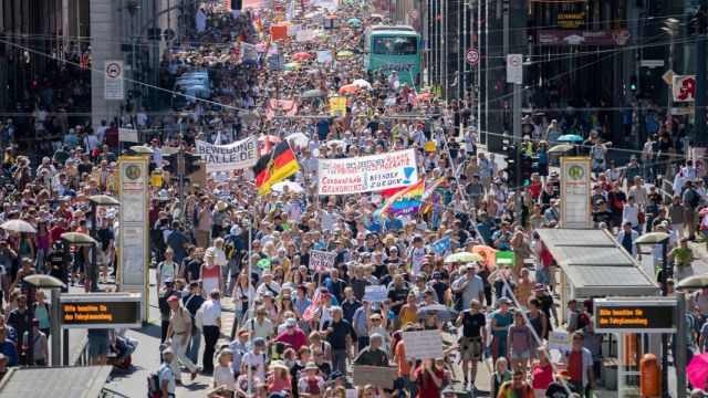 A crowd of people whistling and cheering, and with few masks in sight, marched through downtown Berlin from the Brandenburg Gate ahead of a rally on a wide boulevard that runs through the city’s Tiergarten park.