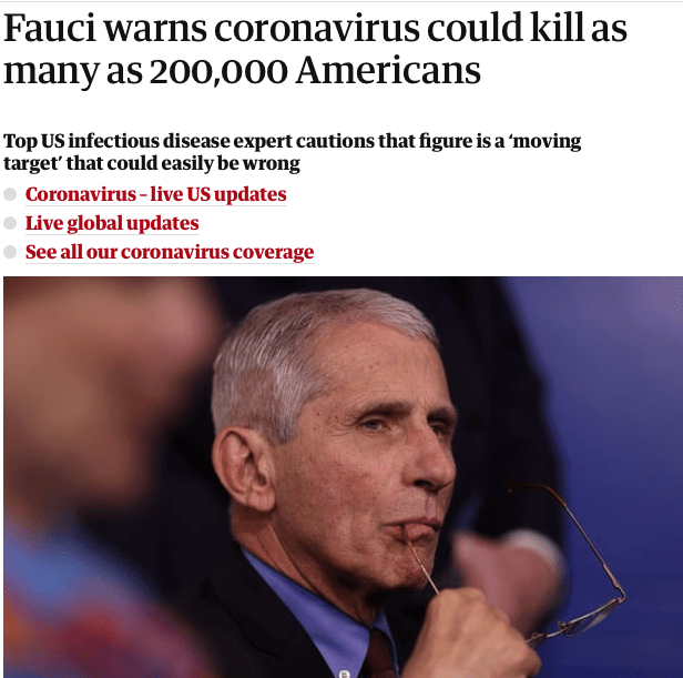 Dr. Fauci promotes the fearmongering narrative, what the system wants you to hear and believe from the mouth of a national authority, namely that the US may experience up to half a million covid-deaths.