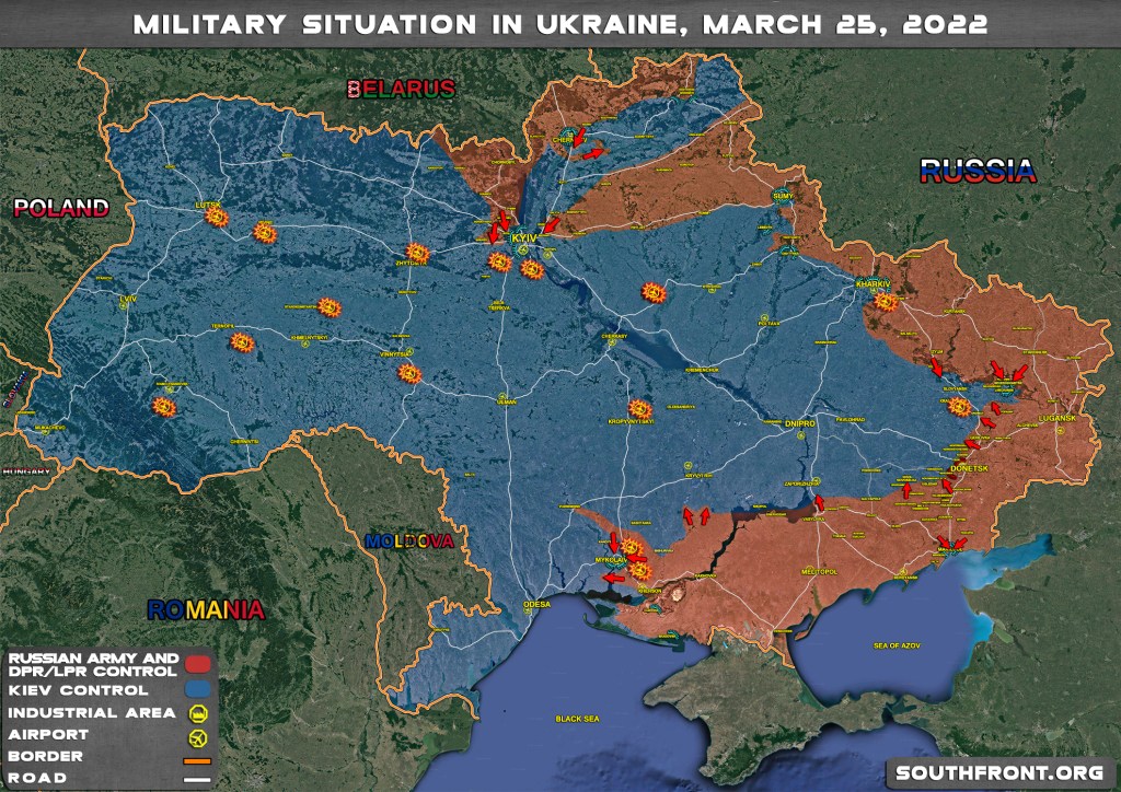 Comment: It appears that Russia is establishing a land corridor connecting Crimea with the mainland. Additional goals may include cutting Ukraine from access to the Sea of Azov (already achieved), as well as from the Black Sea, if Mykolaiv (Nikolaev) and Odessa are taken by Russia in the next phase of military operations. It is a slow offensive. It is taking a long time in order to avoid unnecessary civilian casualties and minimize own military losses. This step-by-step approach helps Russia in concentrating on one or two areas of operation at a time, while remaining fronts are “digging in” and waiting for their turn. Will Russia attempt to secure and establish a buffer zone between itself and NATO by taking control over, or annexing, the eastern Ukraine (east of the Dnieper River), remains to be seen.