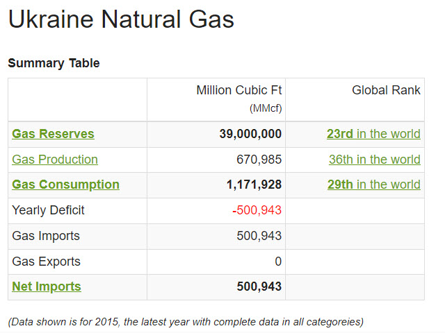 Ukraine produced only half of its consumption of natural gas, it imported the rest. It exported zero. Some fields were under development, with the main oil and gas corridor (The Dniepr – Doneck Oil and Gas Basin) affected by conflicts since 2014.