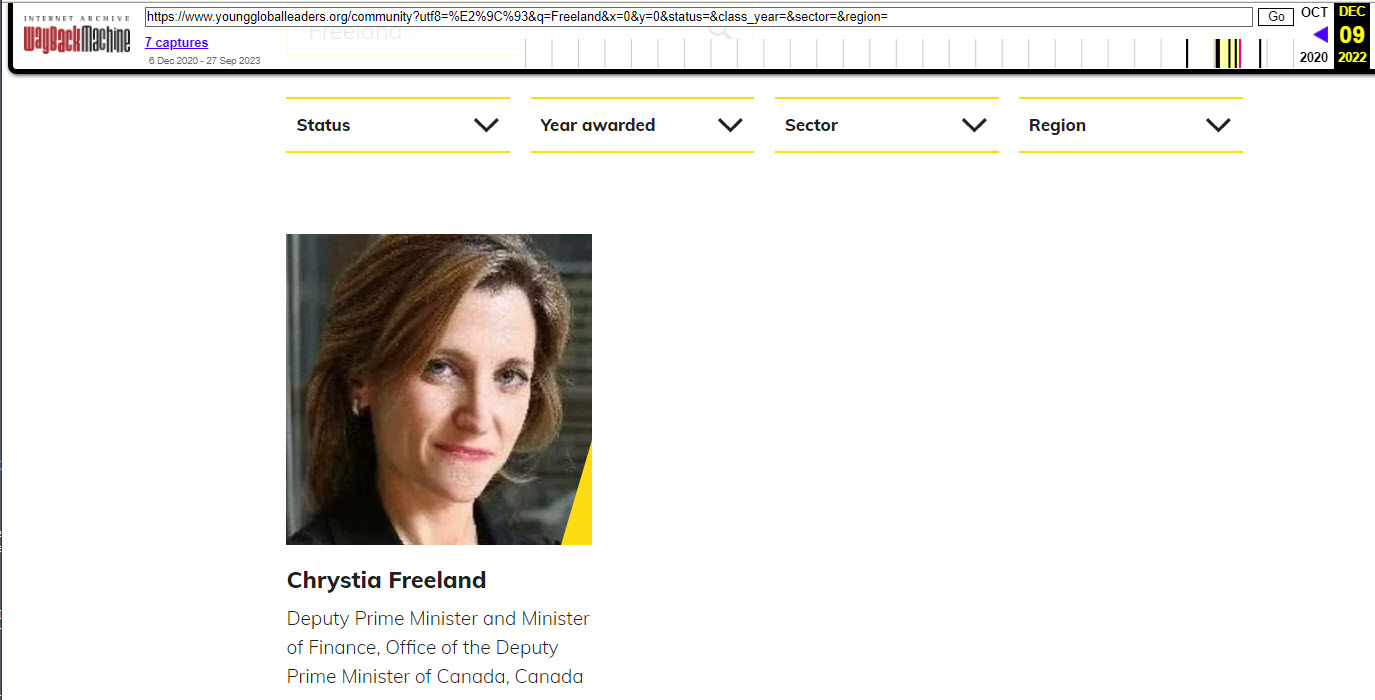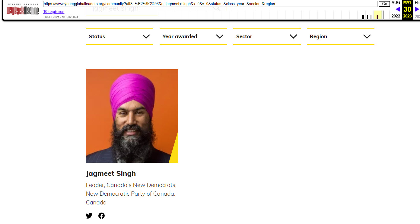 Comment: “Quote: “…obviously, Jagmeet Singh is right in bed with Justin Trudeau.” I would rather say that both are in bed with Klaus Schwab and the WEF. Add to it Chrystia Freeland and you will have a fuller picture. Justin Trudeau, as a “WEF Agenda Conributor”, is documented here . The WEF “Young Global Leaders” used to be officially listed here: Freeland and here: Singh but these pages were removed – I wonder why. Is it because they are not “young” anymore, or is it because they went “undercover”? However, the Wayback Machine has captured these old pages, before they have “disappeared”. Here are their snapshots, with dates when they were saved by the Wayback Machine:
