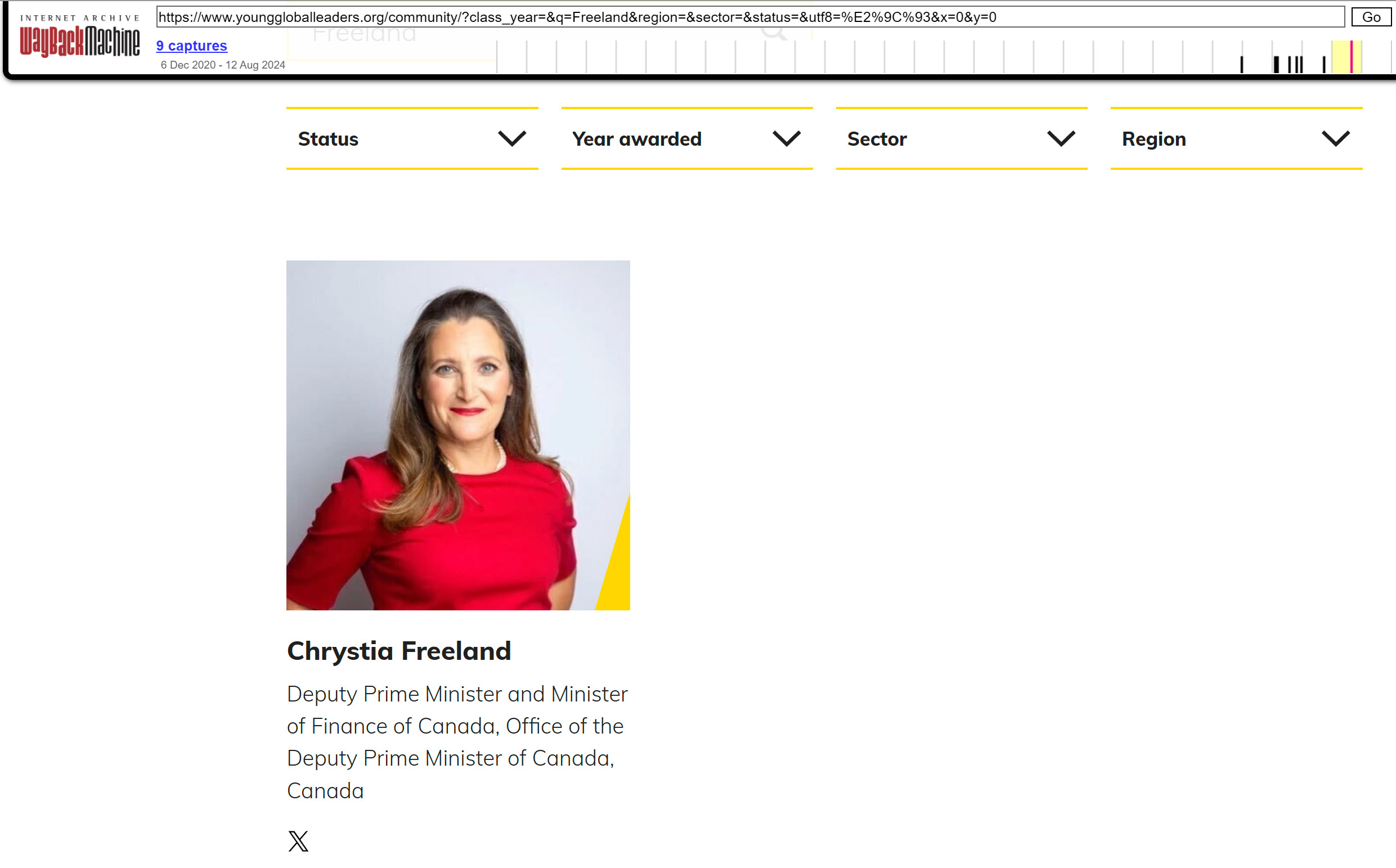 - Chrystia Freeland and the WEF (This page was recently removed). However, the Wayback Machine has captured two older pages, before it has “disappeared”. Here are the snapshots of Chrystia’s pages as WEF’s Young Global Leader, with the date when they were saved by the Wayback Machine: